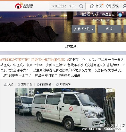 據新浪微博爆料:#名博曝光#【漢中衛生系統多輛救護車“違法”10多年 交警部門涉嫌不作為】@記者小7 漢中衛生系統多輛120急救車不按《交管法》懸掛牌照,市民反映安全隱患大。市衛生局領導:”無牌違法屬交警管理“,@漢中交警 相關領導:“無牌120存在十多年,前年和衛生部門溝通過均無結果"。
