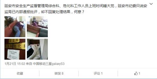 據(jù)新浪微博爆料:延安市安全生產監(jiān)督管理局綜合科、危化科工作人員上班時間睡大覺,延安市紀委只說安監(jiān)局已內部通報批評,卻不回復處理結果,何意?