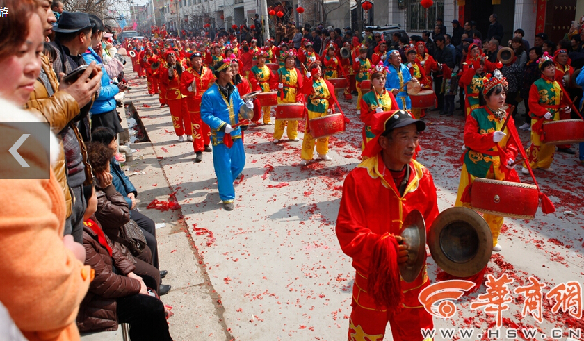 隊(duì)伍緩緩行進(jìn)到村子南北走向的主干道上,鑼鼓大賽便正式開(kāi)始,各村列隊(duì)逐一進(jìn)行鑼鼓表演,你方唱罷我登場(chǎng)。接“爺”隊(duì)伍中的男女老幼們紛紛穿著鮮艷的民俗服飾,化著喜慶的濃妝進(jìn)行歡快的表演,隊(duì)伍中穿著鮮艷服裝的女子扭著秧歌,與敲鑼打鼓的漢子形成剛?cè)釋?duì)比。圍觀的村民將整個(gè)主干道圍得水泄不通,街道兩邊的路面,窗戶(hù),甚至屋頂站滿(mǎn)了人。當(dāng)日大約有3萬(wàn)人參與表演和觀看。