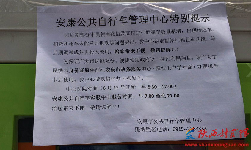 昨日上午,安康市民龔先生通過手機掃碼租公共自行車時,發現自行車站點張貼著安康市公共自行車管理中心的特別提示:“近期部分市民用微信及支付寶掃碼租車數量暴增,出現借還車、扣費和還車未能及時退款的問題,我中心暫停掃碼租車功能……請大家前往安康市政務中心辦理租車卡后使用。”