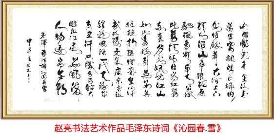 趙亮:您過獎了。應邀我題字,創作書畫作品,實話實說的確不少。我為毛澤東和周恩來的舊居題字“楊家溝舊址”;為《走進毛澤東展覽館》題寫“延安精神永放光芒”;為《世界英才》題書《習近平總書記追夢這一年》主題書法作品“務實新民鐵骨擔當,新政治國富民興邦”;為湖北省書寫習近平總書記詞《念奴嬌·追思焦裕祿》一丈二的巨幅書法佳作,懸掛政府辦公大樓大廳;為中央軍委“八一”大樓書寫了“清風高誼”書法,繪畫作品“寒梅雪香”、“富貴吉祥紅牡丹”;為中國人民武裝警察部隊天安門國旗護衛隊題字“國旗護衛”;為中國飛行試驗研究院題寫“試飛鋪就通天路”;為解放軍西安第四軍醫大學題寫牌匾“推進精品戰略,建設軍衛明院”;為北京火車站、北京西站題寫“賓至如歸”,繪畫“云影山暉”;為新疆生產建設兵團題字“暢通為民”;為新疆維吾爾自治區國家安全廳題寫“忠誠”;為廣東省題寫“欣達雅教育集團”;為中國中央電視臺、解放軍“八一”電影制片廠題寫片名“國殤”、“為了生命”、“劍上的夢”、“情系大地繪中華”。近年來,我先后應邀赴朝鮮、新加坡、馬來西亞、日本、美國、加拿大等國家進行書畫藝術交流。榮獲全國級各類獎40余項。被授予中國改革開放30年書畫藝術創作金獎和中國最具創新十大書畫藝術名家稱號;被世界英才十大風云人物評委會評為“世界英才十大風云人物”。當選中國畫院陜西分院副院長。