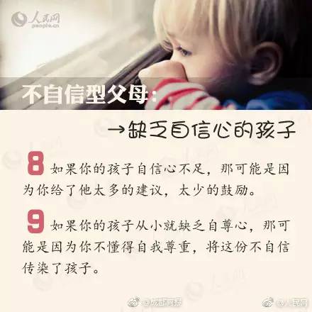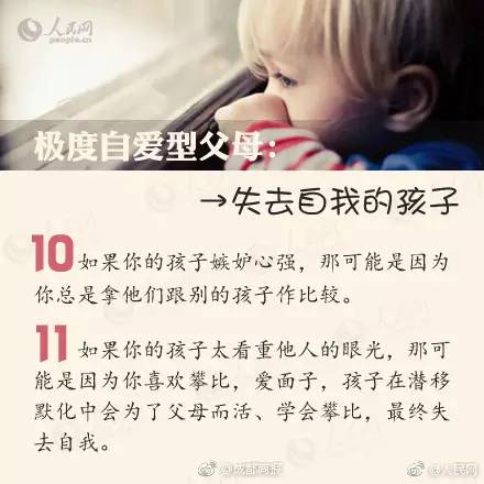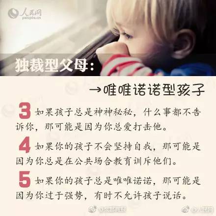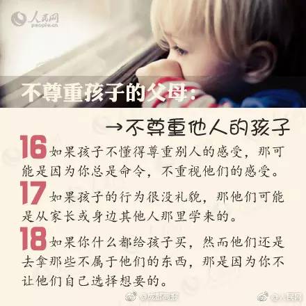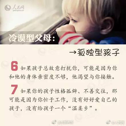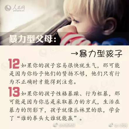 ①完美主義型父母→謹小慎微型孩子;②獨裁型父母→唯唯諾諾型孩子;③冷漠型父母→孤獨型孩子;④暴力型父母→暴力型孩子……原生家庭對人的影響,遠不只富有貧窮。學會理解與尊重,學會分享與擔當。轉給新手爸媽!