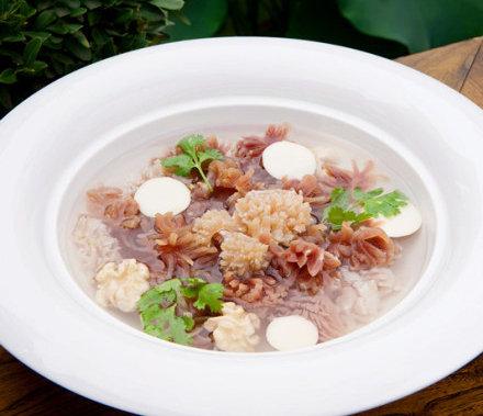 源于唐代,原名叫“攢雙丞”,影射武則天當(dāng)政時專靠告密和嚴(yán)刑逼供而臭名昭著的尚書左丞周興和御史中丞來俊臣的。當(dāng)時廚師因恨“雙丞”而創(chuàng)此菜。以豬肚頭、雞肫為主料,配以核桃仁和口蘑汆制而成,脆嫩鮮美,香色誘人,是高級筵席的上乘湯菜。