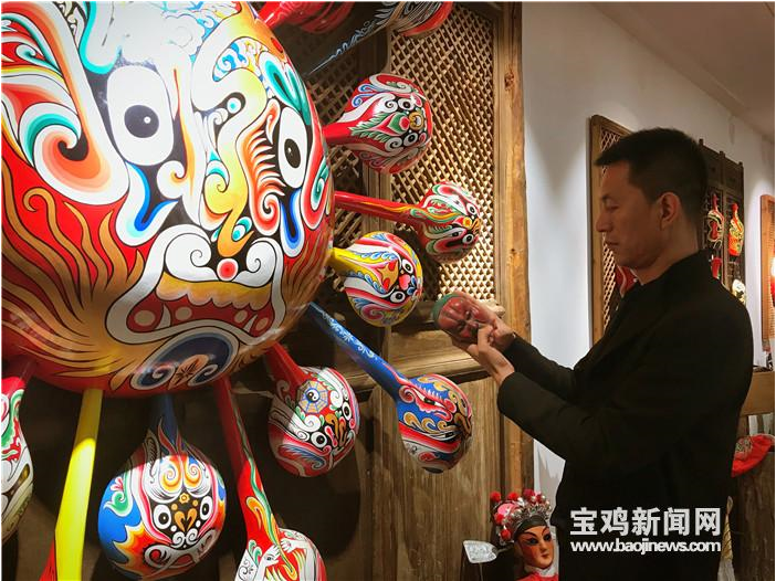 社火臉譜藝術是寶雞非物質文化遺產具有代表性的藝術形式之一,歷史久遠、造型奇特、色彩鮮明。陜西省工藝美術大師、寶雞社火臉譜技藝傳承人薛亞兵,則用獨特的臉譜和木偶展示了寶雞社火歷史的變遷。薛亞兵時常從老藝人那收集社火臉譜及木偶。