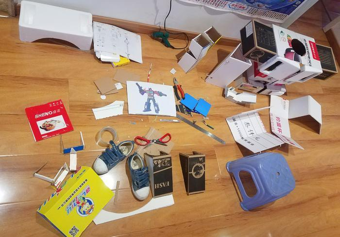 根據圖紙,劉煒用了6個紙箱制作了大大小小上百個零部件,然后用了50多根熱熔膠,將這些部件拼接在一起,做出擎天柱的大概外形,然后將彩色打印紙貼在外面進行美化。為了形象更加逼真,劉煒還專門用毛筆沾著打印機廢棄油墨畫出汽車人的機器質感。 整個變形金剛高達一米五左右,重達10斤,分為頭盔、上衣盔甲、下肢、鞋子、武器幾部分,一共制作了十幾天,每天都要近十個小時。