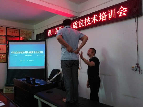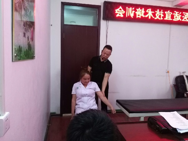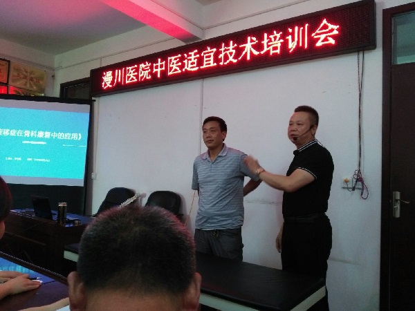 史主任首先從引起疼痛的起因,疼痛的分類,疼痛的發生機制,讓大家正確認識疼痛,強調壓強是導致疼痛的一個關鍵因素,局部的壓強增高,疼痛的感覺增強。然后詢問現場有沒有疼痛患者,現場為大家解決疼痛。兒科的程醫生以前搞計劃生育工作長期上山下鄉,疲勞工作,患有腰椎間盤突出癥5年,時常間斷性腰痛,起坐困難,腰部酸痛,史主任經過現場動態位評估,認為程醫生為腰屈曲疼痛,左右回旋幅度較正常小,通過運動康復指導、腹壓重建、腰椎間盤復位等治療,程醫生的腰痛癥狀明顯緩解。不吃藥不打針就能治療疾病,讓在場的醫務人員認識到中醫藥適宜技術的神奇和浩海無邊。史主任隨后又現場抽取了頸椎病、網球肘、腱鞘炎病人,現場解決疾病,講解骨骼、肌肉解剖結構及動態結構平衡的知識,傳授中醫藥適宜技術治療方法,教導大家處理疼痛的思路不能僅僅只盯著疼痛部位,要找相關聯性的解剖結構和肌肉運動模式,明確原因,才能達到有效治療。
